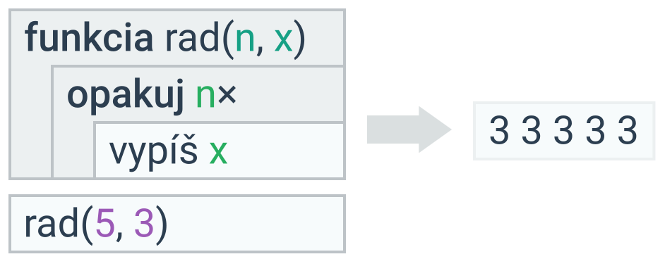Funkcia môže mať parametrov viac. Oddeľujú sa väčšinou čiarkou. Prvý parameter sa nastaví na prvý predaný argument, druhý parameter na druhý predaný argument atď. V nasledujúcej ukážke sa nastaví n = 5, x = 3 a vypíše sa päť trojok. Ak by sme volali rad(3, 5) nastavilo by sa n = 3, x = 5 a vypísali by sa tri päťky.
