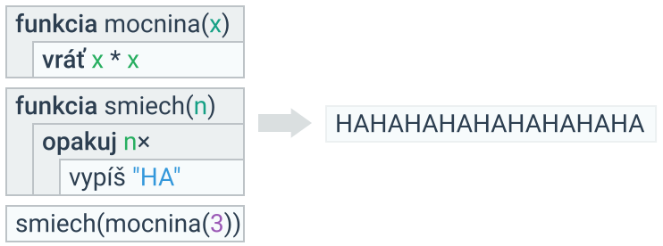 Funkcie môžu vracať vypočítanú hodnotu pomocou kľúčového slova vráť. Také funkcie je potom možné využiť v rámci výrazov, resp. všade, kde sa očakáva nejaká hodnota. V nasledujúcej ukážke je možné využiť funkciu mocnina pri volaní funkcie smiech, pretože mocnina(3) vracia hodnotu 9. Keby funkcia mocnina výsledok vypisovala, ale nevracala, nebolo by toto možné.