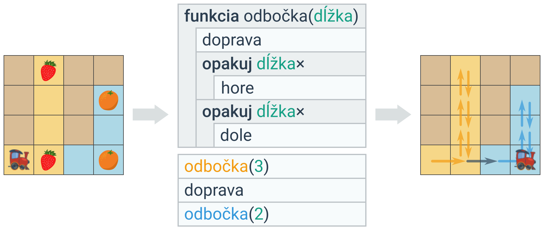 Parametre funkcie môžeme vnímať ako špeciálne premenné. Predaným hodnotám parametrov sa hovorí argumenty. (V ukážke vyššie je parametrom meno dĺžka, kým čísla 3 a 2 argumenty.)